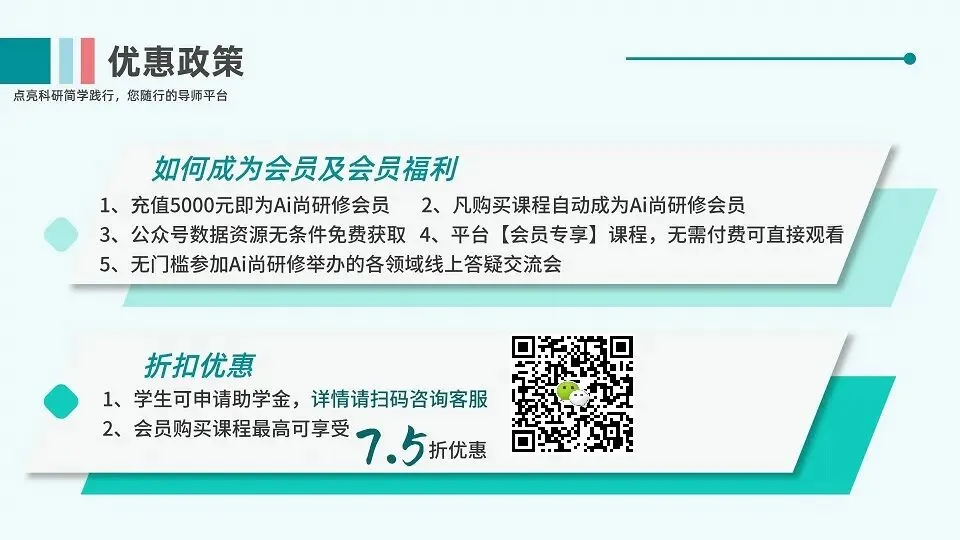 1.参加直播、视频课程费用累积进行折扣,享8.5折-7.5折 (一阶会员8.5折,高阶会员8折,尊享会员7.5折);2.参与课程组织与报名,推荐者可获得课程5%推荐现金;3.免费享受Ai尚研修会议平台中“会员免费”视频教程;4.长期免费参与针对各领域简学实用公开课(无门槛);5.免费参与开设的导师面对面线上答疑交流;6.Ai尚研修资源站分享中数据免费下载。