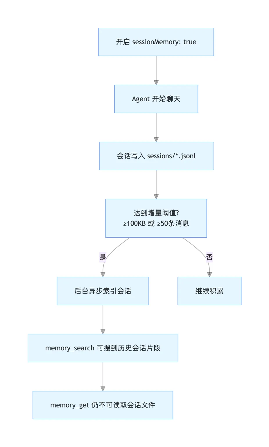会话记忆 = 让 Agent 搜历史聊天 默认关闭,手动开启 后台索引,不卡界面 达到 100KB / 50 条 才索引 (可根据参数改) 只能搜片段,不能读全文 每个 Agent 独立隔离 存在本地磁盘,注意权限