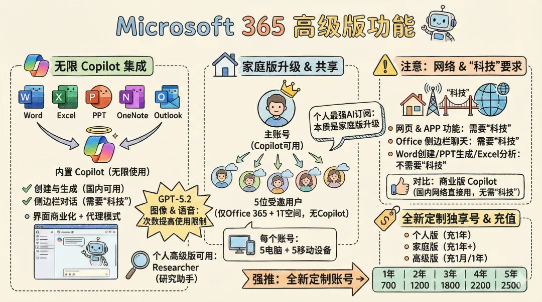 激活office365(可邀请1-5人),每账号1T空间onedrive,激活5台电脑+5台移动设备 在Word、Excel、PPT、OneNote和Outlook桌面应用中内置copilot,无限使用,创建与生成功能国内可用(侧边栏需要科技) 商业版copilot中的 researcher(研究助手)目前也可以在个人高级版中使用