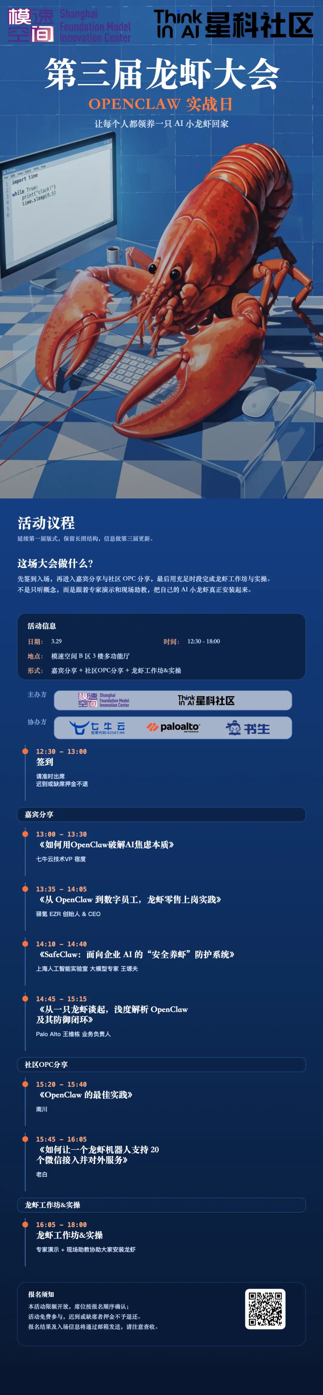 3月29日(本周日)13:00,由七牛云联合模速空间、ThinkinAI 等举办的「第三届龙虾大会 —— OpenClaw 实战日」即将正式发车!