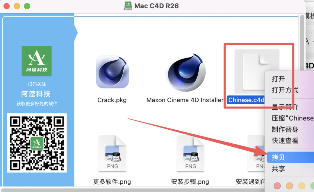 回到安装包中,把【Chinese.c4dupdate】拷贝一份到桌面或者其他文件夹中。