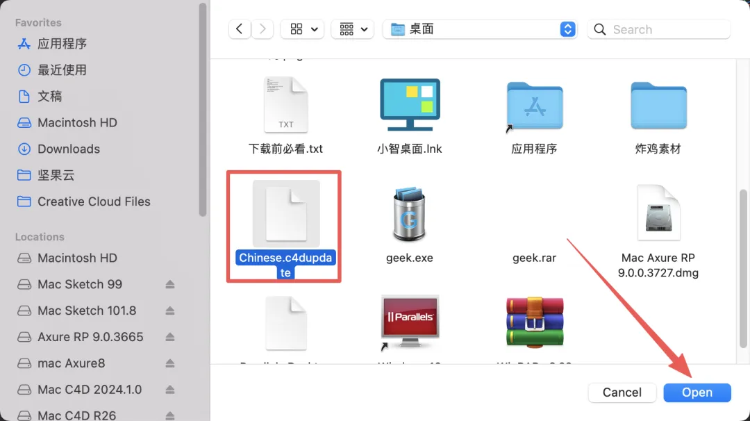 18.选择刚刚拷贝的【Chinese.c4dupdate】文件,然后点击Open。