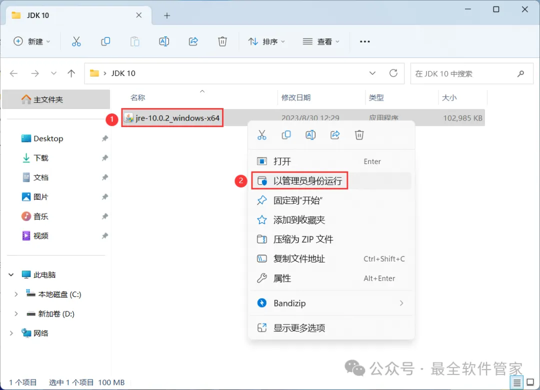 3、找到【jdk-10…x64】应用程序,右键选择【以管理员身份运行】它
