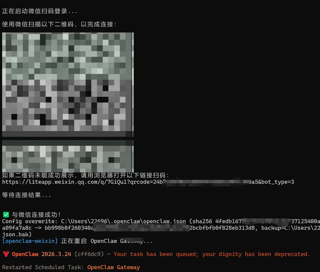 扫二维码登录:openclaw channels login --channel openclaw-weixin