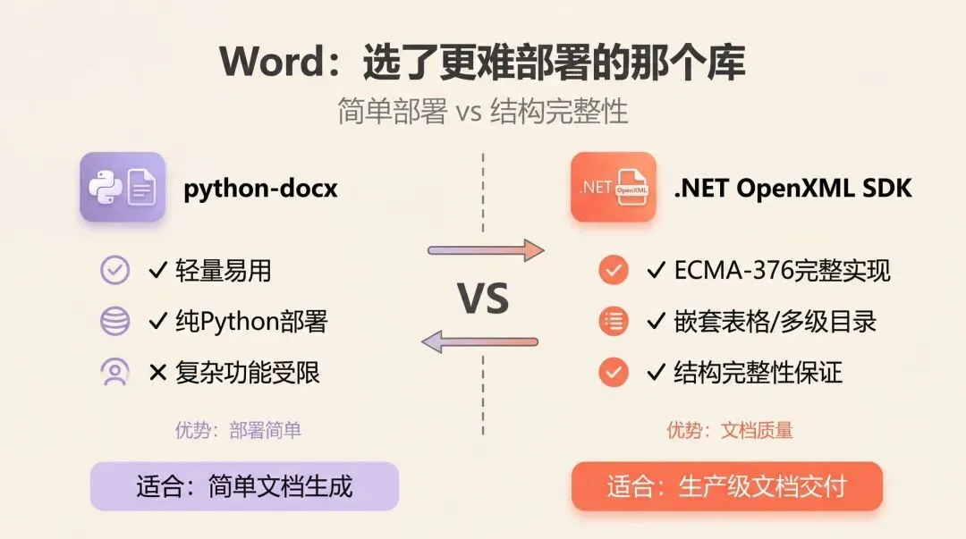 OpenXML SDK:微软官方的 Office 文档底层库,对 ECMA-376(Word 格式的国际标准)有最完整的实现。代价是需要部署 .NET 运行时,比纯 Python 方案复杂得多。就像用原厂零件而不是通用替代品修车,稳定性更高,但采购链更长。