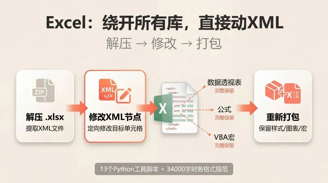 一个 .xlsx 文件本质上是个 zip 压缩包,里面装着 XML 文件。就像把一栋楼的图纸装进档案袋,想改某个房间,就把那张图纸取出来,只修改它,再放回去。解压,定向修改目标单元格的 XML 节点,重新打包。每次编辑只碰需要改的部分,样式、图表、宏保持原样。