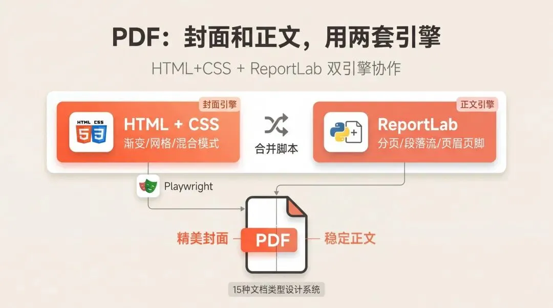 他们的解法是用两套引擎分别负责不同部分。封面用 HTML + CSS,通过 Playwright 渲染成 PDF,因为 CSS 原生就能处理那些视觉效果,大多数专用 PDF 绘图库在这里都很笨拙。正文用 ReportLab,提供工程层面稳定可预期的控制。最后用合并脚本把两部分拼成一个完整的 PDF。