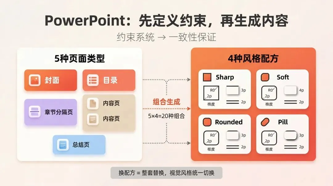 他们规定了五种标准页面类型,封面、目录、章节分隔页、内容页、总结页,每种都有明确的布局规则和元素定位。然后设计了四种风格配方,Sharp、Soft、Rounded、Pill,每个配方是一套完整的数值集,圆角半径、阴影参数、边框粗细、间距比例全部写定。