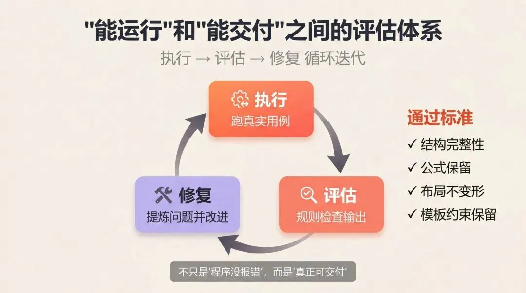 要检查结构是否完整,公式是否还是公式,布局在读写过程中有没有静默变形,模板约束是否被保留。一个保存成功但丢失了数据透视表的 .xlsx,一个目录能渲染但无法更新的 .docx,都算失败。