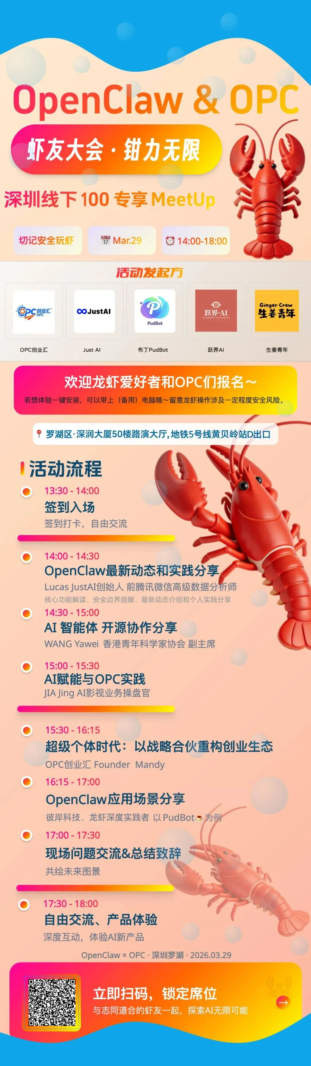 这次活动,我们聊openclaw趋势,也聊玩虾的体验,还会现场带你玩虾;我们不仅聊OPC政策,也请到OPC实践者来分享经验。