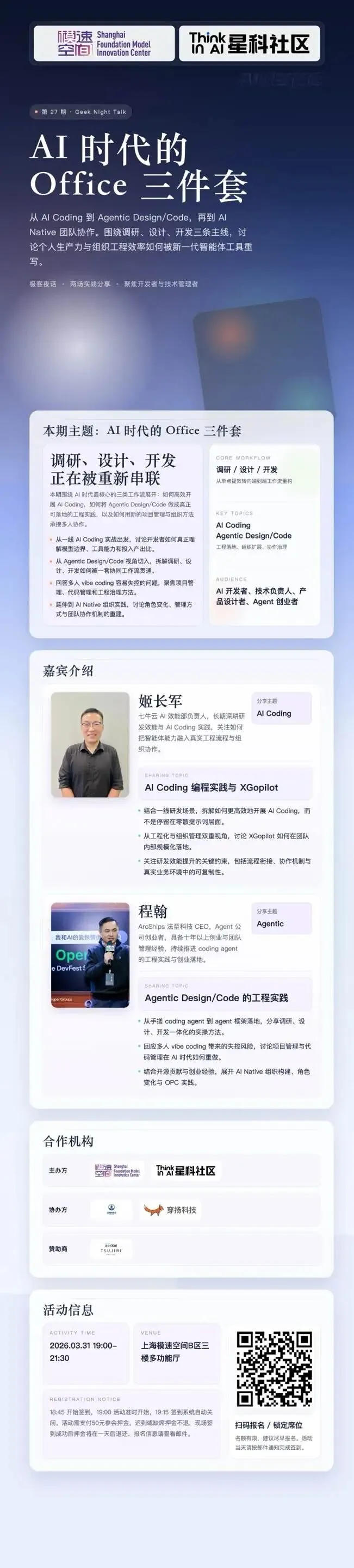 这不是一场泛泛而谈的趋势分享, 而是一次围绕 AI Coding、Agent 工程实践、AI Native 组织协作 的真实拆解。 我们邀请了两位正在一线做事的人, 分别从 企业研发效能落地 和 Agentic Design/Code 工程实践 两个方向出发, 把 AI 时代最核心的几个问题讲清楚。