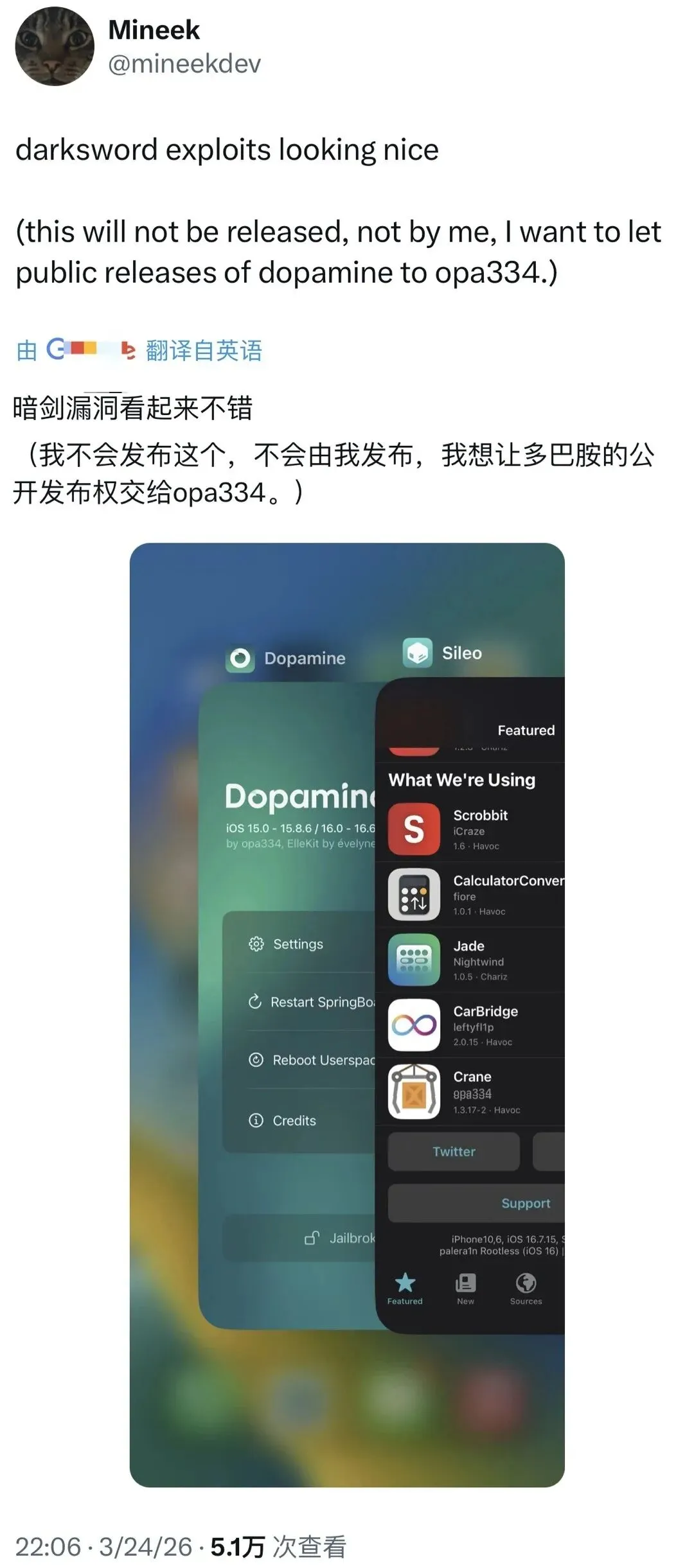 值得一提的是,这次越狱并非个人炫技,Mineek明确表示不会私自发布工具,而是将整合后的Dopamine提交给官方开发者opa334,由其统一更新发布。这也意味着,接下来的公版工具会更稳定、更安全,避免了非官方版本的后门和兼容问题,搞机党只需耐心等待,不用再担心踩坑。