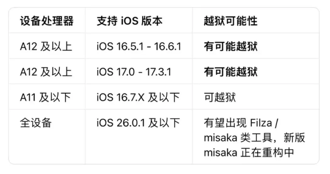 这次基于DarkSword漏洞的越狱,打破了以往的版本限制,不同处理器的设备迎来了不同的越狱机会,尤其是A11及以下的老设备,直接迎来「史诗级福利」,具体适配范围划重点: