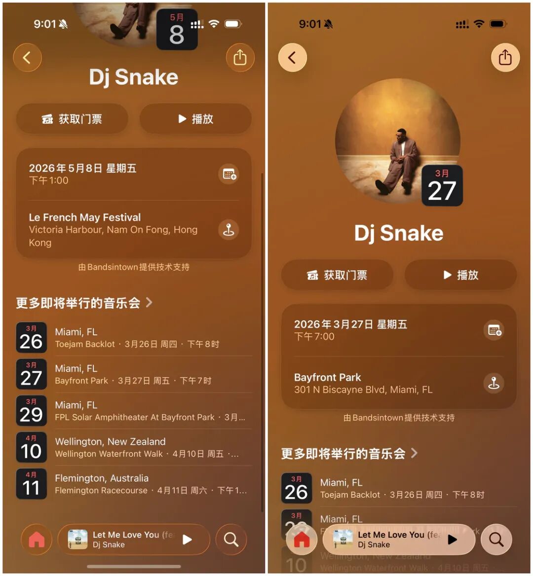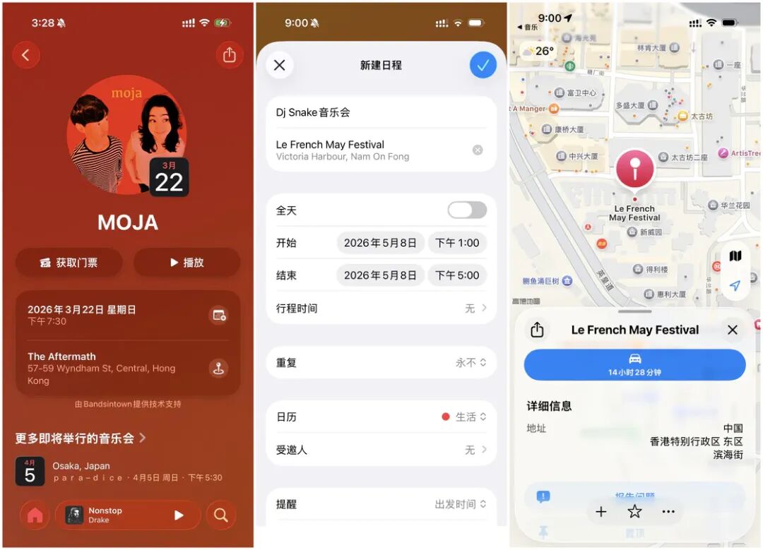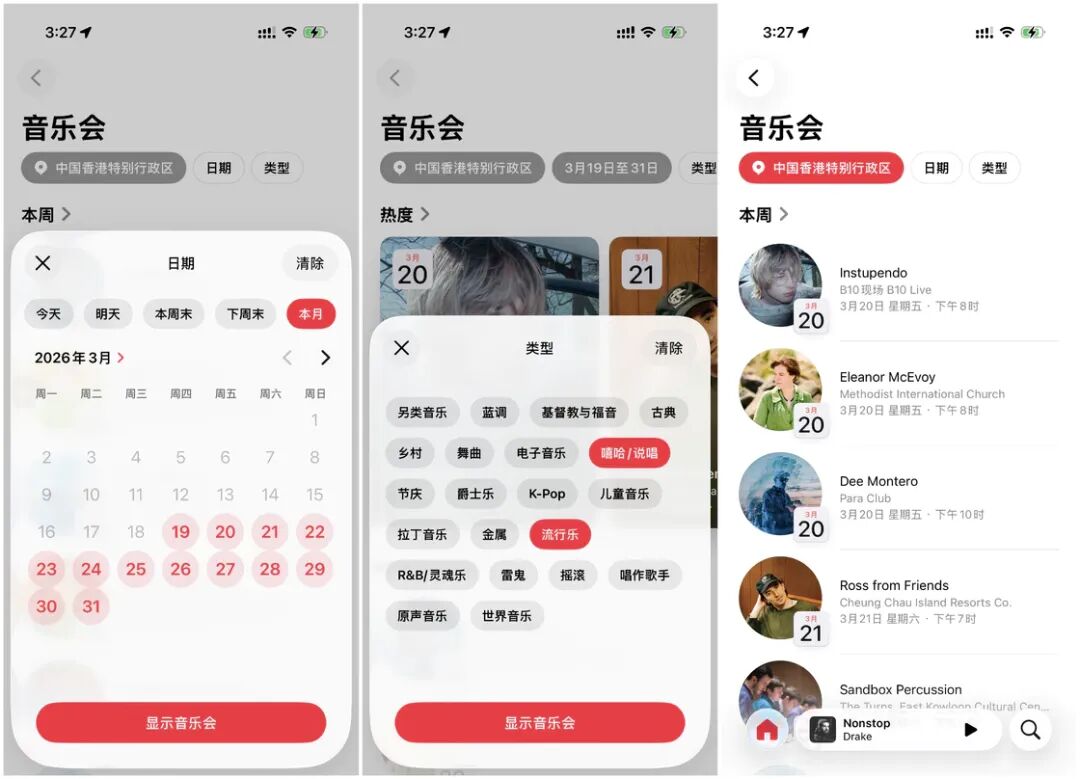 如果你用过 Spotify,你应该看到过附近的演唱会功能。在新版本中,Apple 也为 Apple Music 中加入了类似的功能。在「主页」标签页中,往下拉可以看到一个「音乐会」的入口,第一次点击后需要设置当前的地点(稍后也能更改),然后我们还能选择日期范围和音乐类型,经过筛选后 Apple Music 就会按照时间线显示符合条件的音乐会。