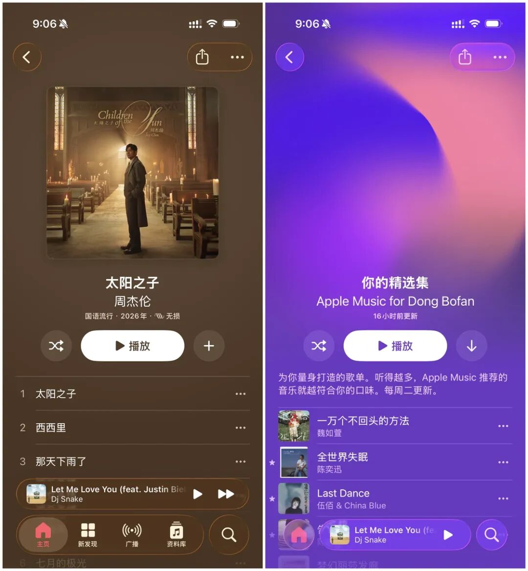在新版本中,Apple 修改了专辑界面和播放列表界面的设计,现在整体 UI 色调会自动跟随当前封面图的色彩动态进行变化,而且整个界面全屏显示,带来更加沉浸式的体验。