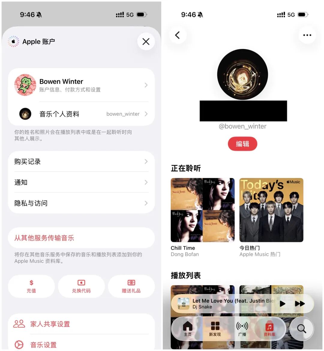 Apple Music 中的个人页面在新版本中和 App Store 中的个人页面进行了统一,可以直接查看购买记录、通知、隐私与访问等信息,也可以和 App Store 个人页面一样进行充值、兑换代码、赠送礼物等操作。