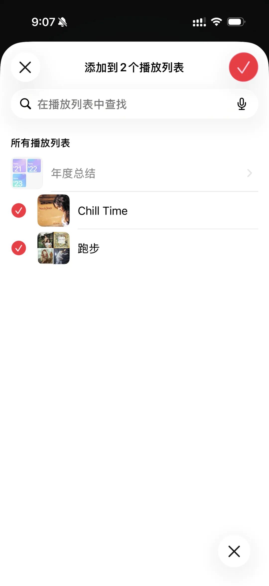 相比于之前我们单次只能将歌曲添加到一个播放列表,Apple 在 iOS 26.4 中对这个操作新增了一个批量操作的功能。在添加到播放列表时,点击右下角的批量操作按钮,我们就可以同时选中多个播放列表,完成将一个歌曲一次性添加到多个播放列表的操作。