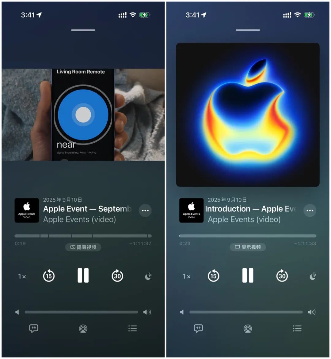 以Apple 自己的节目为例,当我们开始播放这个视频播客时,可以通过点击节目封面下方的「显示视频」和「隐藏视频」按钮来进行无缝切换。