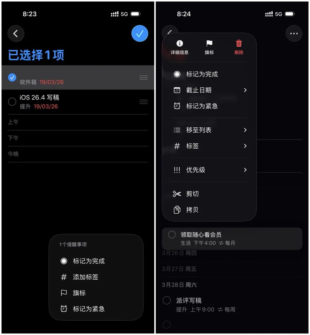 首先,我们可以通过快速工具栏或者长按菜单中的「紧急」按钮来将选中的提醒事项直接标记为紧急的任务,不再需要通过详细信息页面来操作。