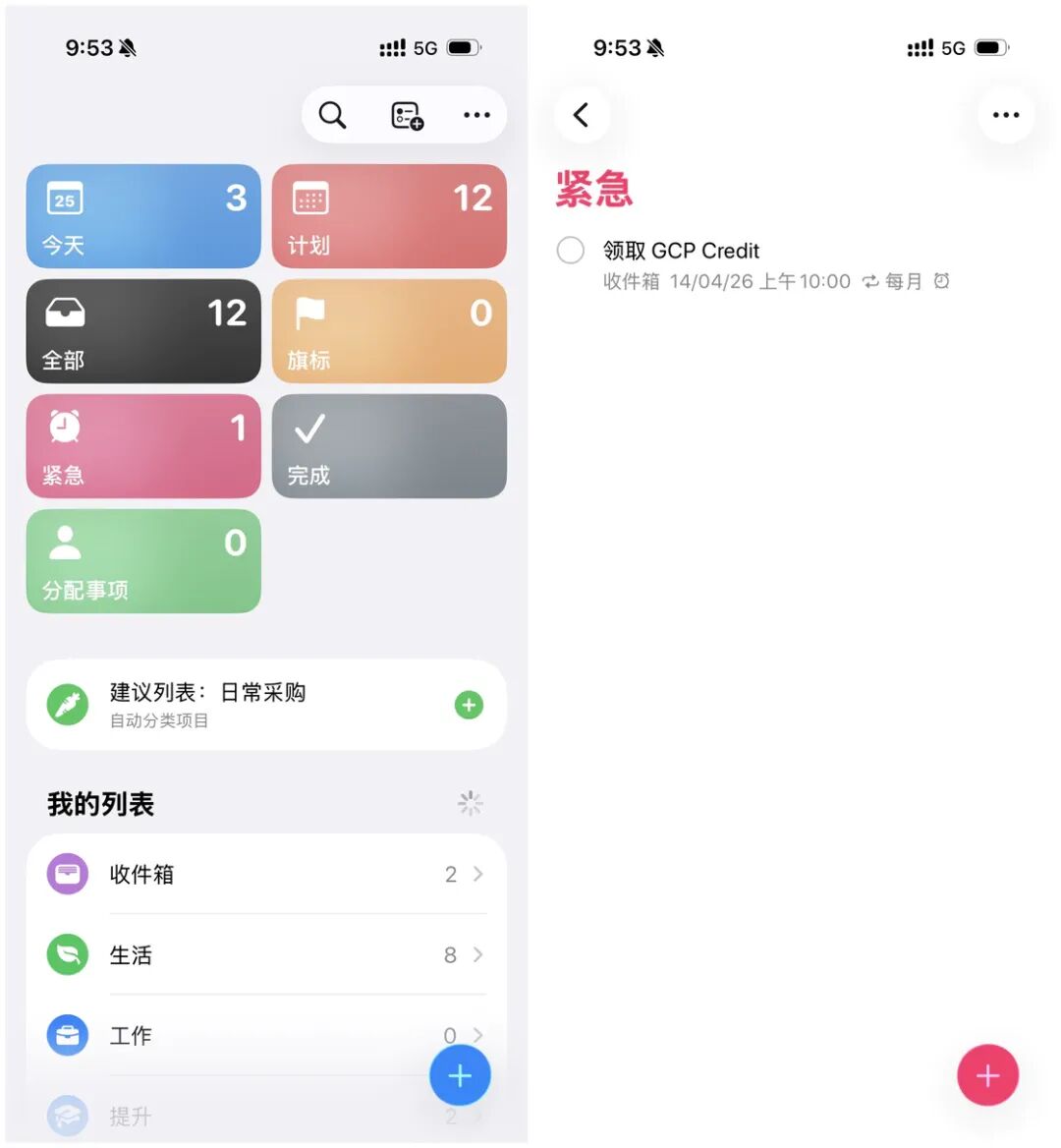 其次,提醒事项新增了一个「紧急」智能列表,所有被标记为紧急的任务都会自动进入这个智能列表,方便统一查看和编辑。