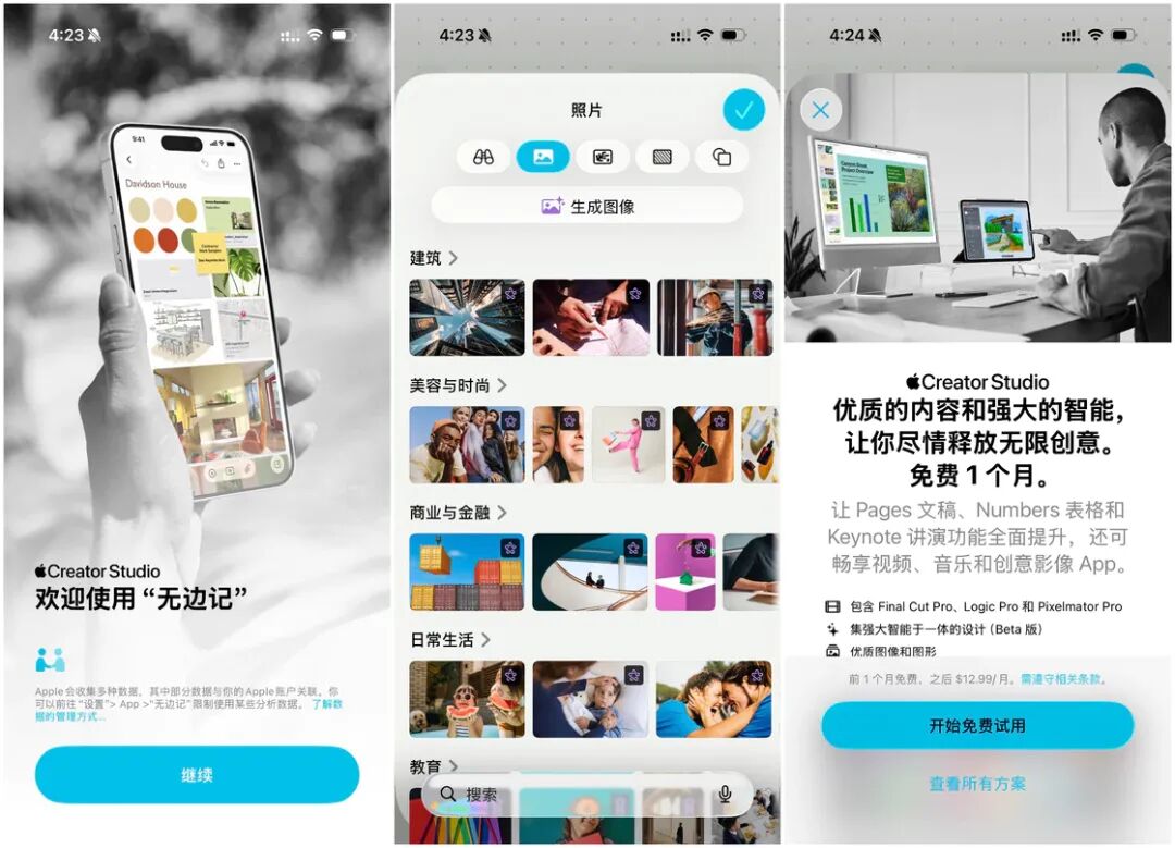无边记在新版本中加入了 Apple Creator Studio 计划,在画布左下角点击高级内容库按钮,就可以看到Apple 内置的素材库,包括了照片、图形、背景和形状四个类型。免费用户可以使用形状素材,其他三种类型的素材添加到画布后有水印。另外,Creator Studio 订阅用户还可以通过 AI 来生成素材, 不过目前尚不清楚是调用了哪个多模态模型。