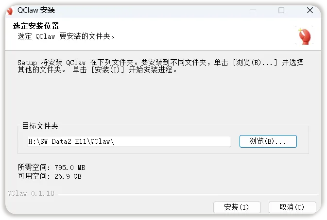 3.在下载路径中双击打开刚下载的程序安装包"QClaw-Setup-0.1.18-5001-198.exe",随后自行决定是否更改安装位置,而后点击>安装<,并等待安装完成。