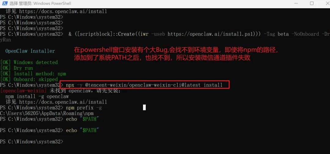 需特别注意:在Powershell直接安装微信openclaw插件会有“找不到已安装openclaw”问题,因环境变量为空。