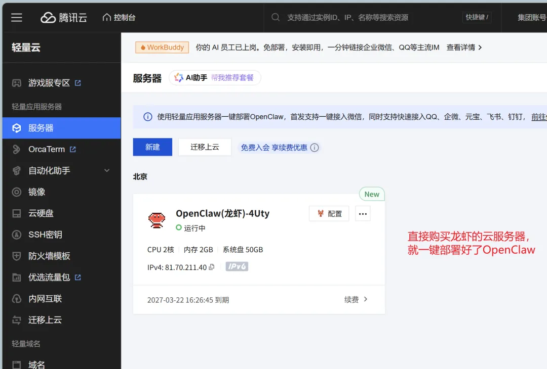 首先登录腾讯云openclaw快速通道,购买openclaw轻量级服务器,此方式购买的云服务器会一键部署openclaw镜像,降低普通人操作门槛。