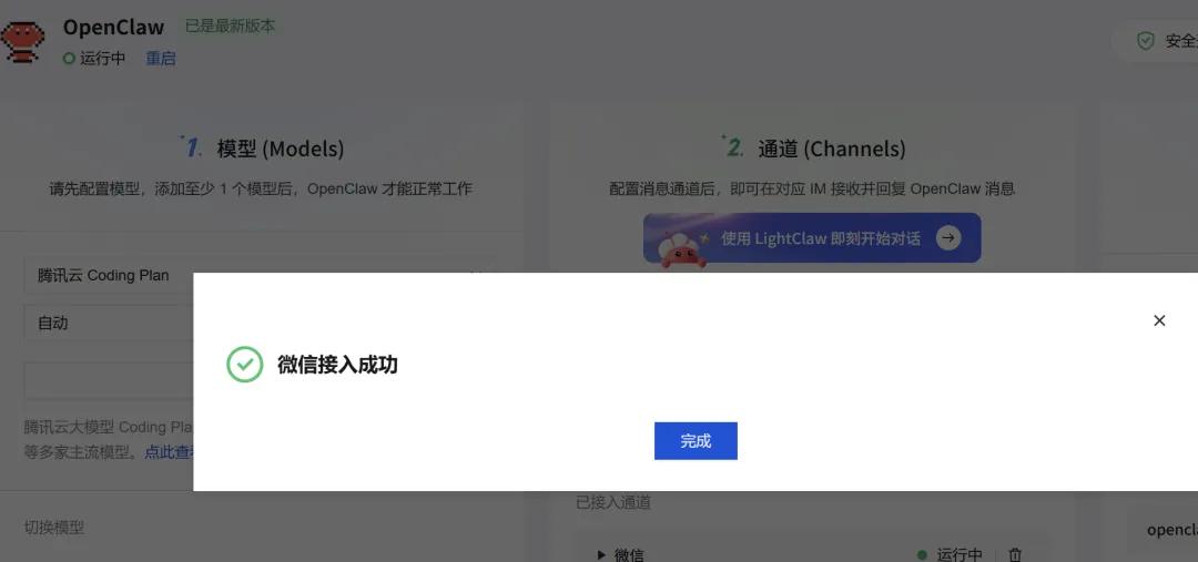 好了,已在腾讯云服务器安装openclaw,现需配置微信授权。
