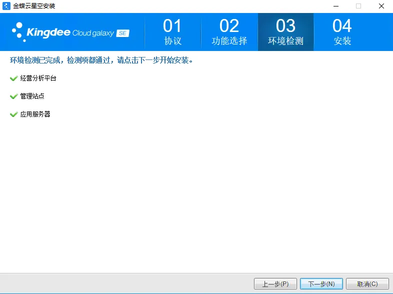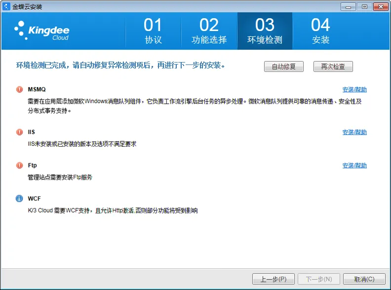 5、点击“安装/帮助”链接可对红色检测项进行处理,红色检测项目全部处理后,再次进行检查确认,处理通过后,可进行金蝶云星空下一步的安装。