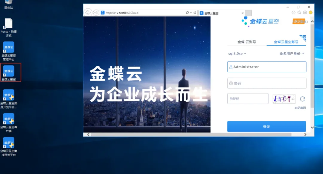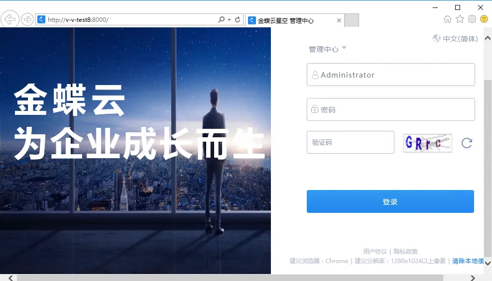 2、管理库创建完成后,弹出管理中心登录页面。管理中心登录账号密码默认为:Administrator\888888