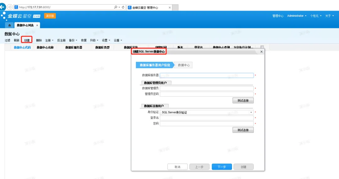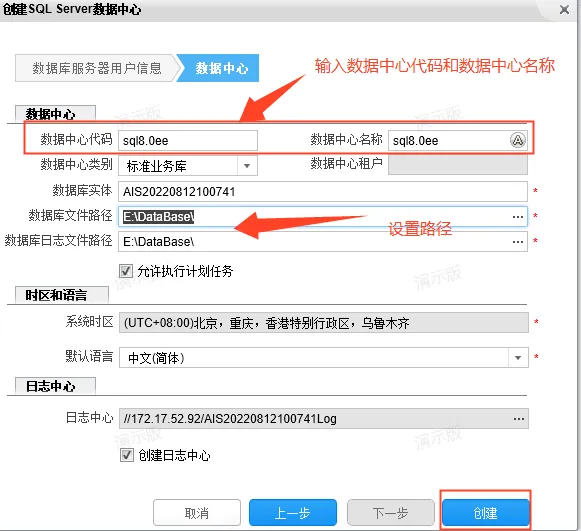 4、输入数据库服务器ip或者机器名,数据库管理员账号,数据库连接用户(同管理数据中心创建),下一步输入数据中心名称,选择数据库实体存放路径,进行业务数据中心的创建。