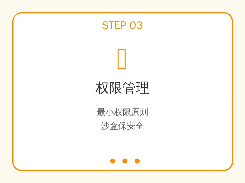 🔒 权限管理与安全隔离权限分级:• full:无限制(个人电脑)• coding:文件+命令+记忆(开发者)• messaging:消息收发(聊天机器人)• minimal:仅状态查看Docker沙盒配置:openclaw config set sandbox.mode docker沙盒限制:文件隔离、网络受限、命令受限、资源上限安全最佳实践:1. 生产环境用沙盒2. 不同Agent不同权限3. 敏感操作人工确认4. 定期检查日志5. 重要数据备份——