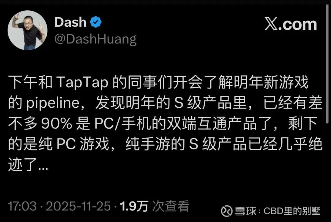 心动 CEO 黄一孟曾在推文中直言不讳地点破一个行业真相:当前 S 级产品中,约 90% 已实现 PC/手机双端互通,剩余则为纯 PC 游戏;纯手游形态的 S 级大作,几乎已绝迹。