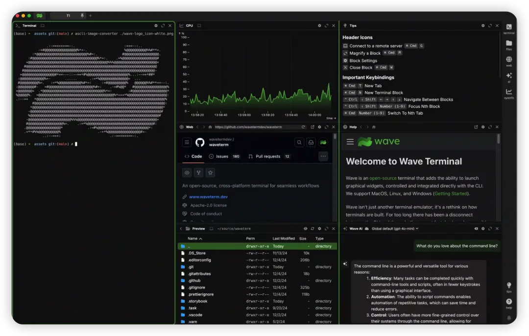 WaveTerm(原名 Wave Terminal)的出现,打破了这种沉默。WaveTerm 定位为一款面向现代开发者的 AI 原生、开源、图形化终端。它不仅仅是换个皮肤,而是利用 Web 技术栈对终端的交互逻辑进行了重构。