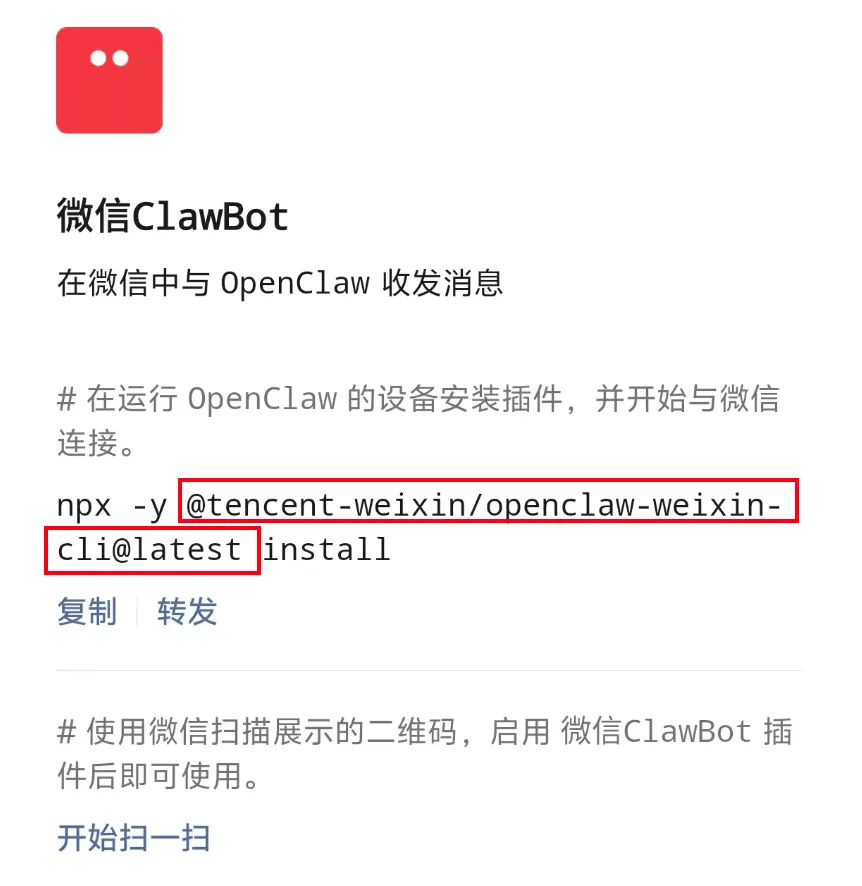 根据官方的插件接入指南可以看到,微信机器人主要是靠一个叫 @tencent-weixin/openclaw-weixin-cli 的 npm 包: