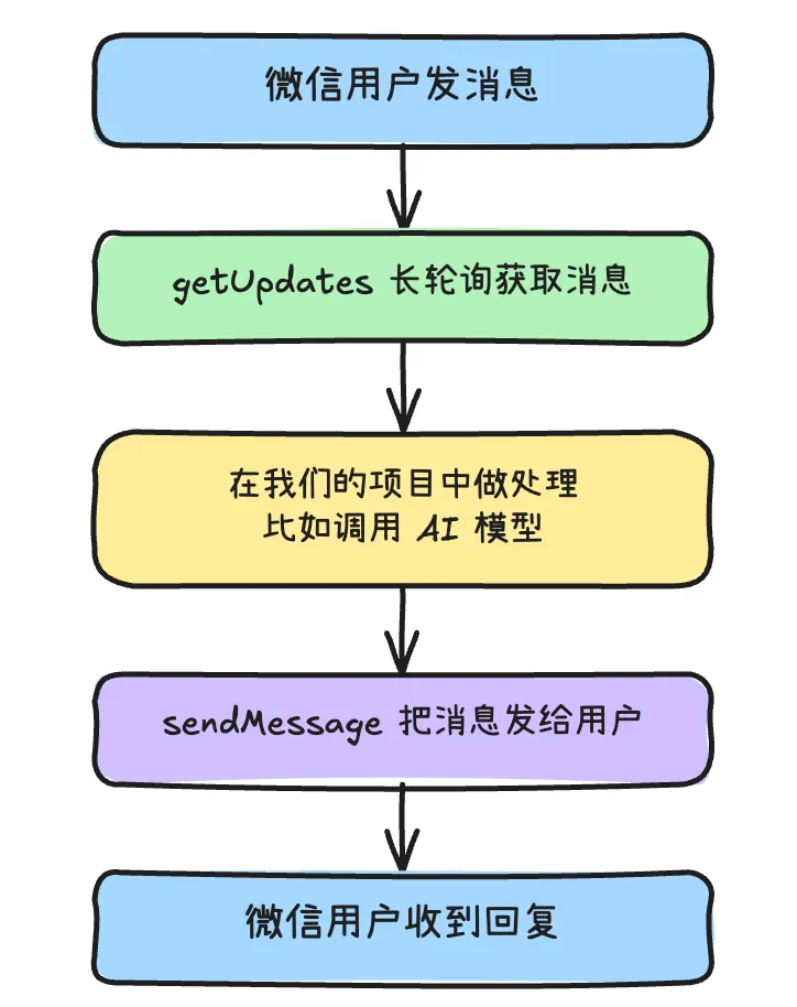 从 @tencent-weixin/openclaw-weixin源码里提取了微信 iLink HTTP API 协议实现了扫码登录方案是 QR 状态机 + 凭证持久化 实现了长轮询收消息 + 发消息的通信层 接入 OpenAI 兼容 AI 模型,支持多轮对话 用一个 while 循环把所有东西串起来