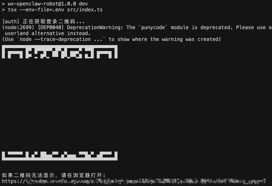 然后用 qrcode-terminal 把二维码渲染到终端里,用微信扫码即可: