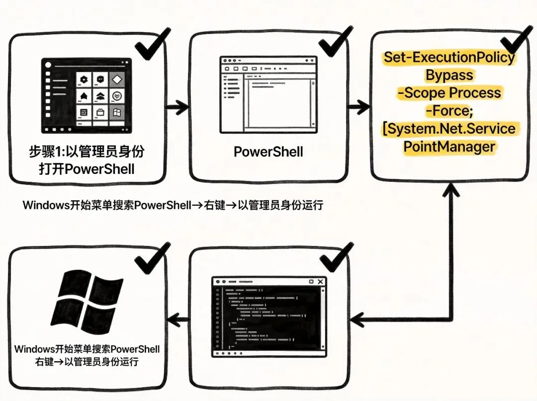 在 Windows 开始菜单搜索「PowerShell」 右键点击「Windows PowerShell」→ 选择「以管理员身份运行」