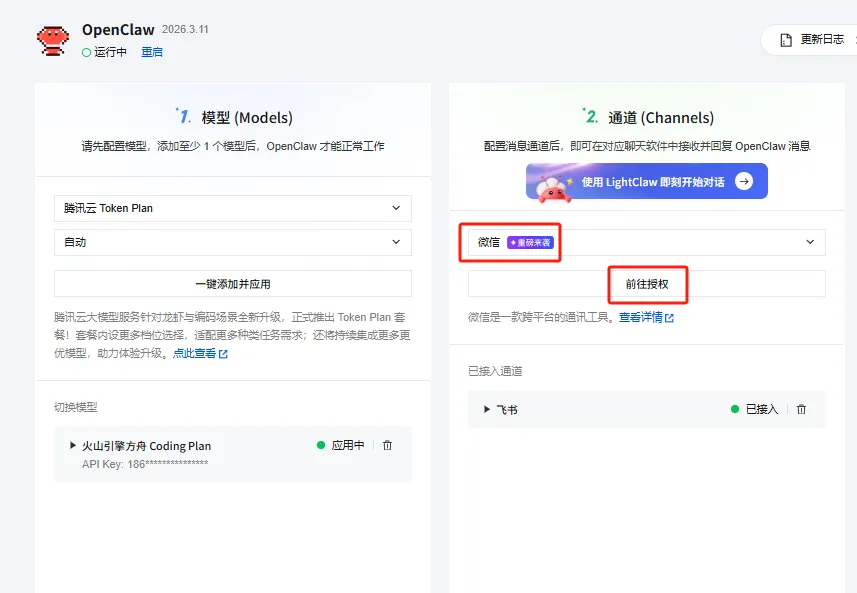 如果你的龙虾也是腾讯云服务器,那我们直接来到Channels界面,直接就能看到微信通道,点击前往授权
