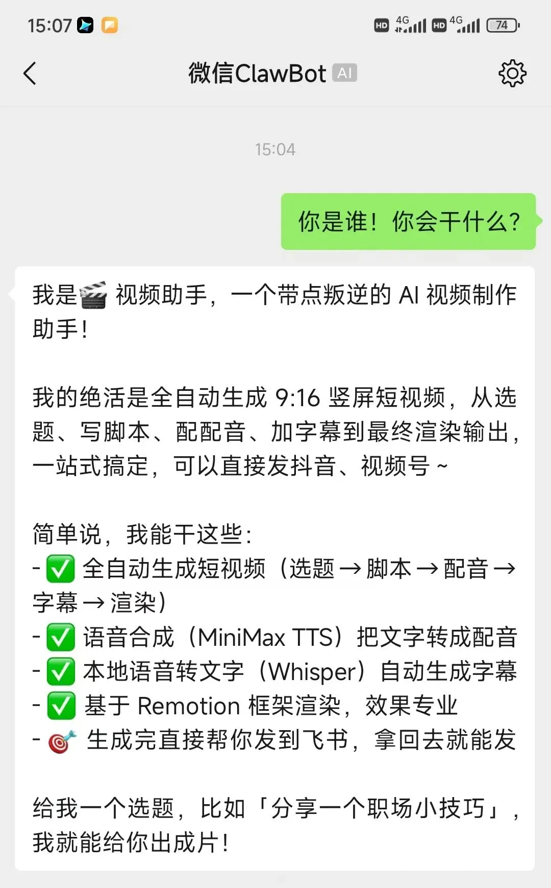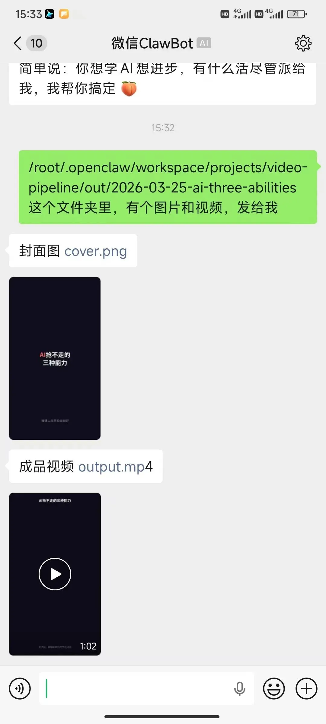 昨天我让我的虾做了一个视频,飞书可以发文件,于是想测一下微信是不是也可以发,竟然直接成了,意外之喜!