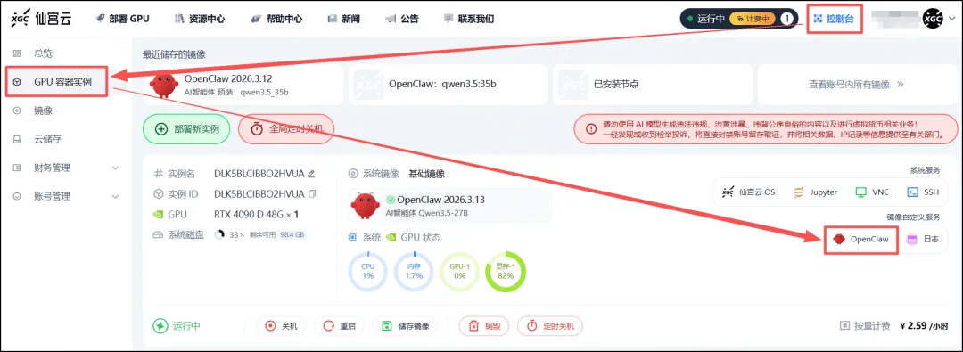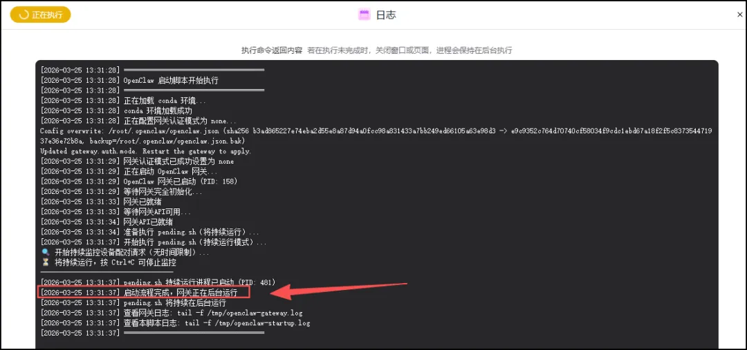 OpenClaw 龙虾 | 一键部署 即开即用 | 云部署教程注:推荐使用48G显存设备 或24G显存多卡部署(内置模型较大,使用24G单卡速度慢 且上下文短)。一、实例部署成功后,右边有日志,可以直接打开日志查看进程。OpenClaw启动需要一些时间,需要等待几分钟,日志里看到“启动流程完成,网关正在后台运行”就代表启动成功是不是非常简单?相信您已经学会了!