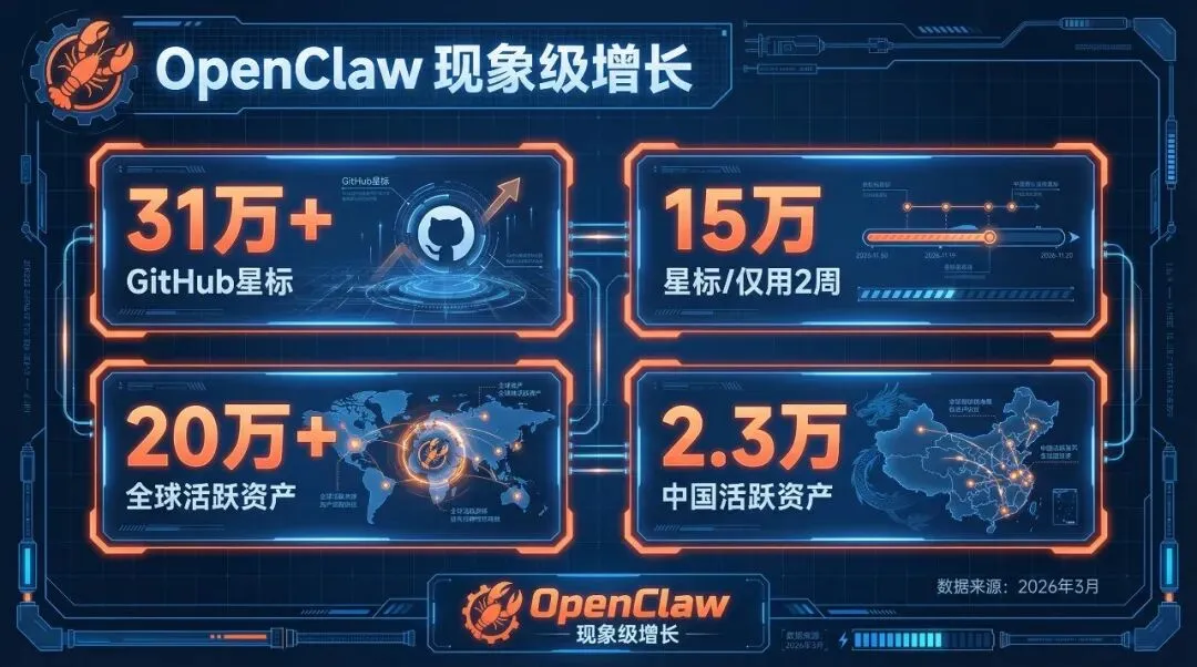 OpenClaw在2026年初发布后迅速走红: - 获得超过31万GitHub星标 - 仅用两周时间就斩获15万星标,创下开源项目新纪录 - 成为2026年第一个重大互联网现象