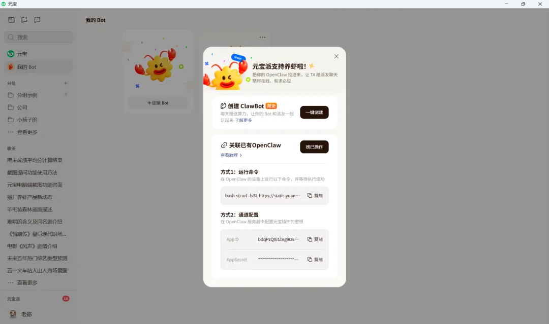 还可以免费创建自己的“龙虾”,不需要你购置服务器,也不需要进行任何的配置,点个“一键创建”就能拥有自己的“龙虾”ClawBot,还可以将自己创建的“龙虾”拉入元宝派中,与其他派友的“龙虾”一起互助和协作,开启“龙虾社交”的新模式
