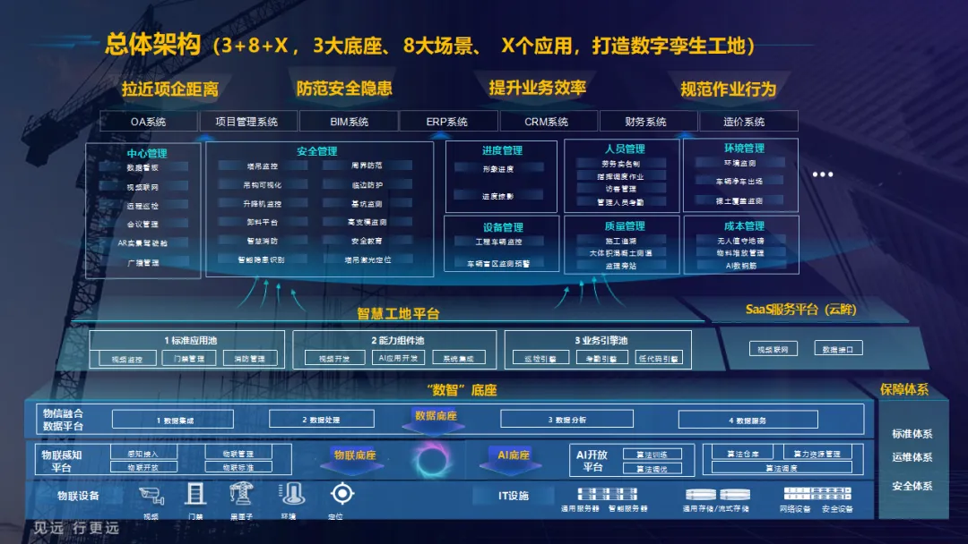 方案采用“3+8+X”总体架构,以物联、数据、AI三大底座为支撑,覆盖中心管理、安全管理、人员管理、质量管理等八大核心场景及X个拓展应用。依托物联网、AI、BIM等技术,通过智能传感器、视频监控、AI识别等设备,实现工地“人、机、料、法、环”全要素数据实时采集与分析,打通项目与企业间的数据孤岛。
