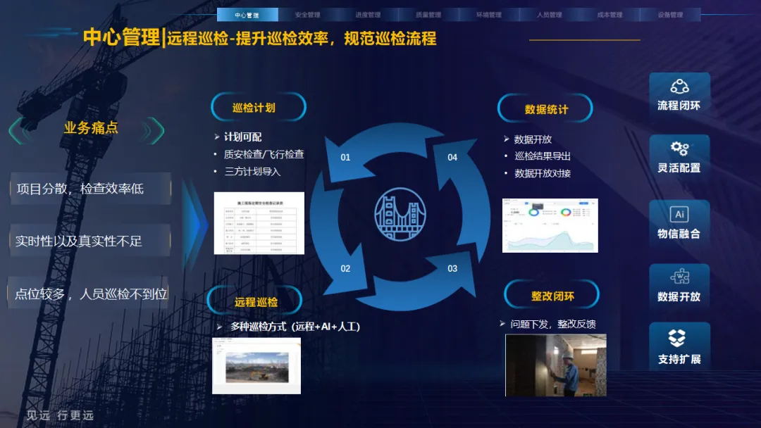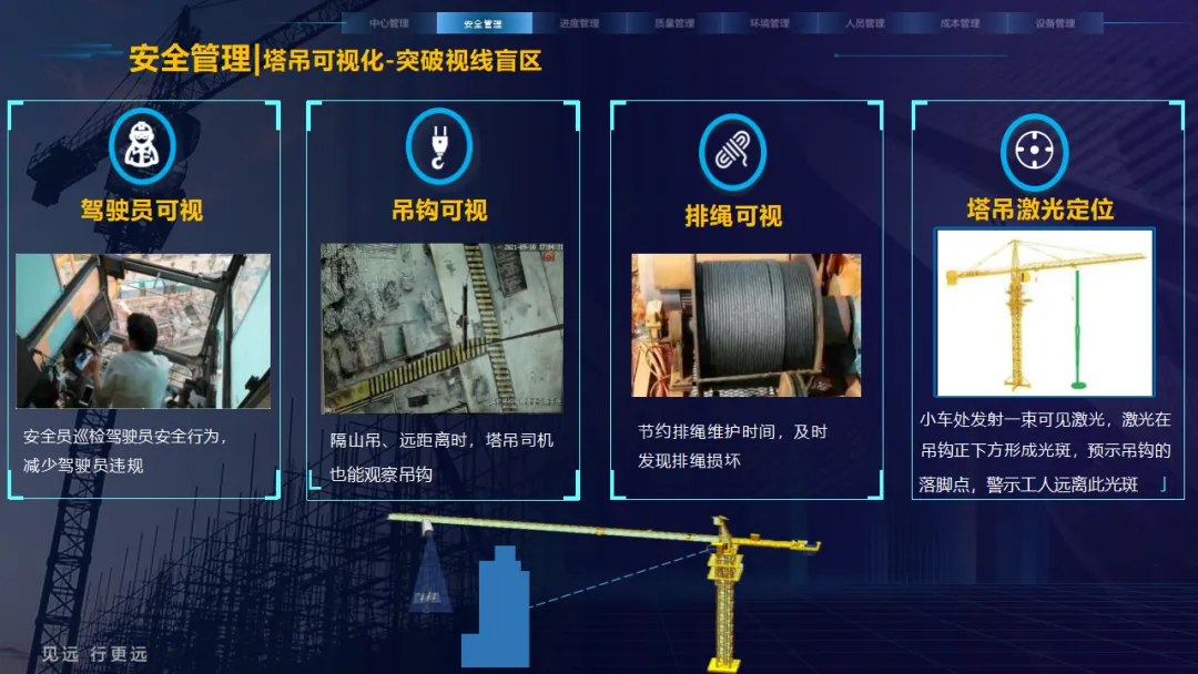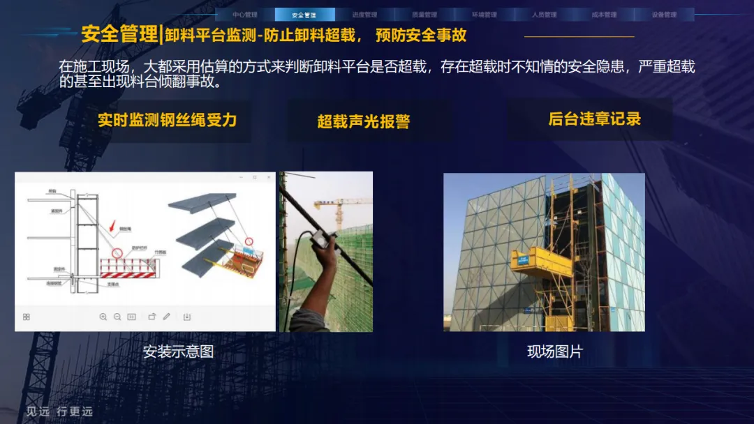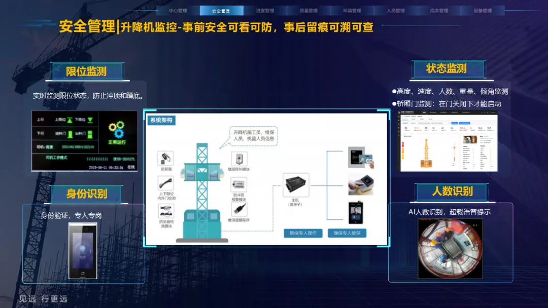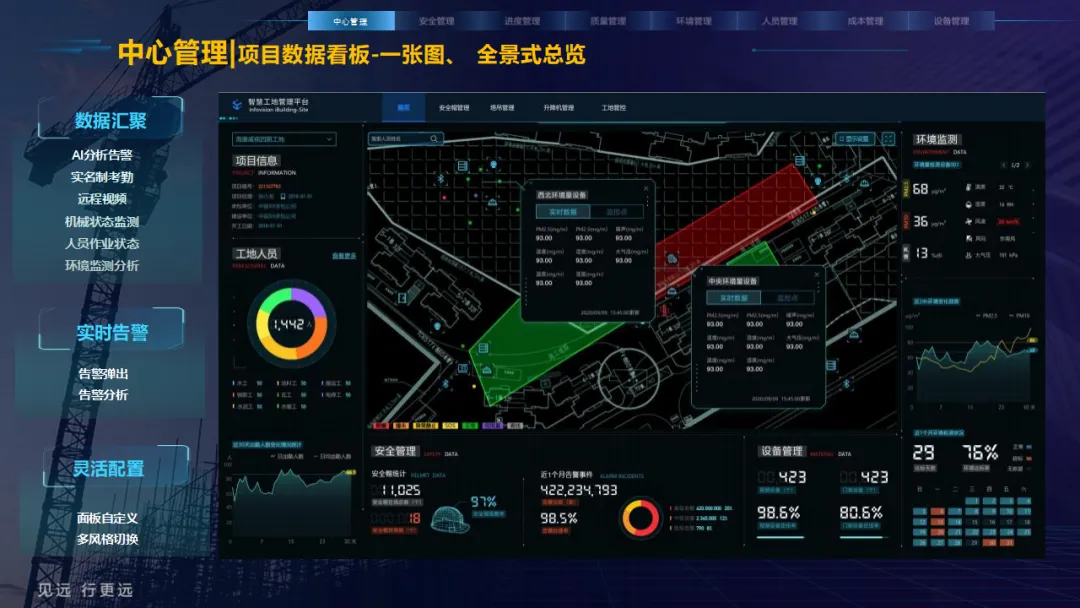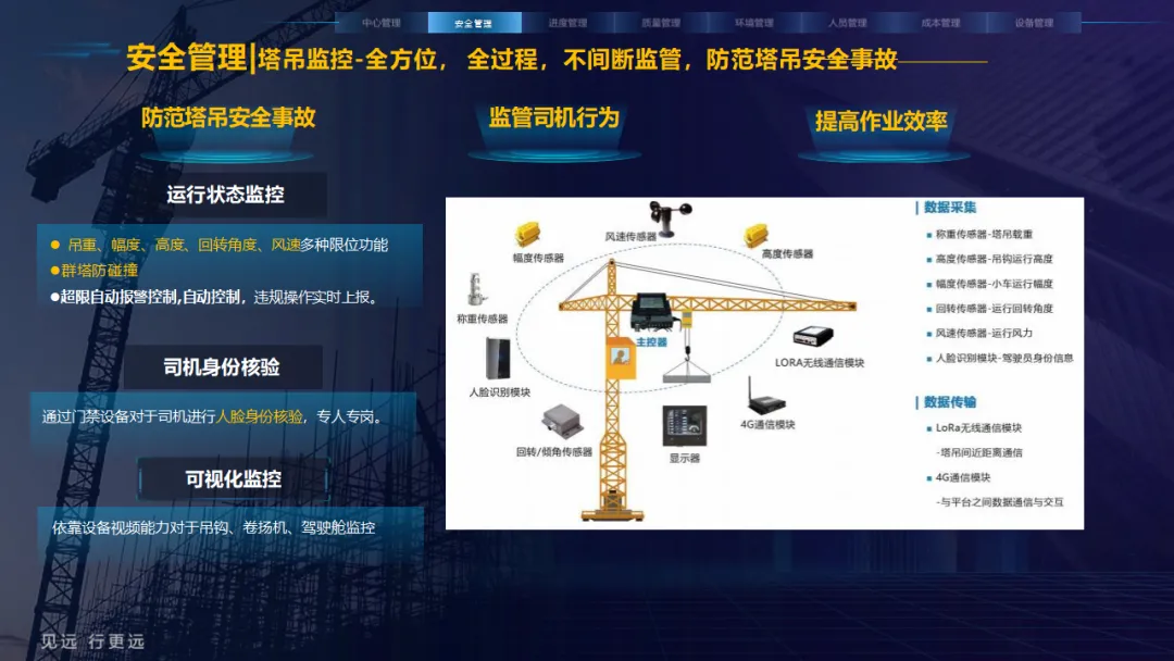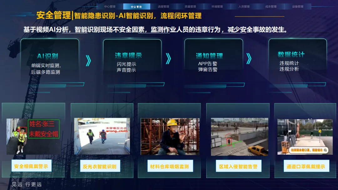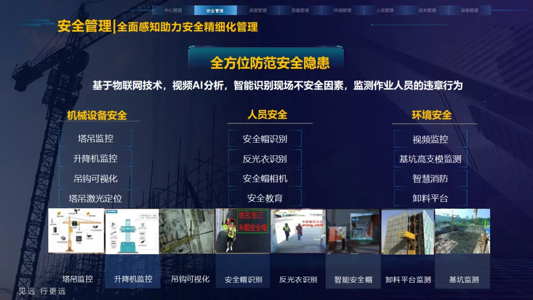 核心应用亮点突出:安全管理涵盖塔吊监控、高支模监测、智能隐患识别等,全方位防范安全事故;人员管理通过劳务实名制、关键人员考勤实现精准管控;环境管理聚焦扬尘监测、裸土覆盖监管、车辆净车出场,满足绿色施工要求;同时配套进度追溯、无人值守过磅、工程车辆盲区预警等功能,覆盖施工全流程。