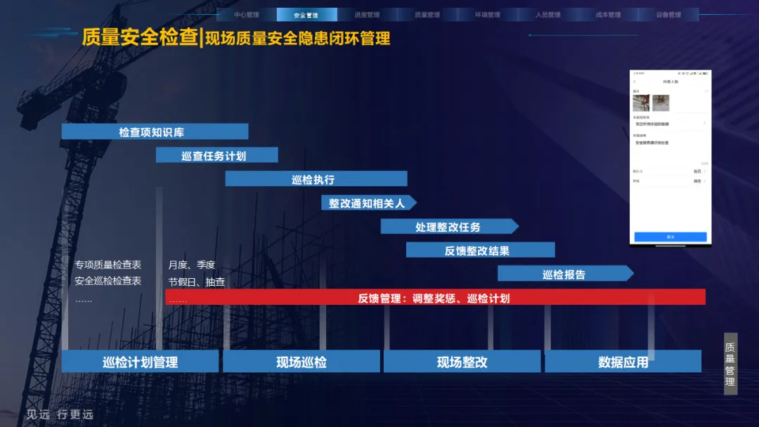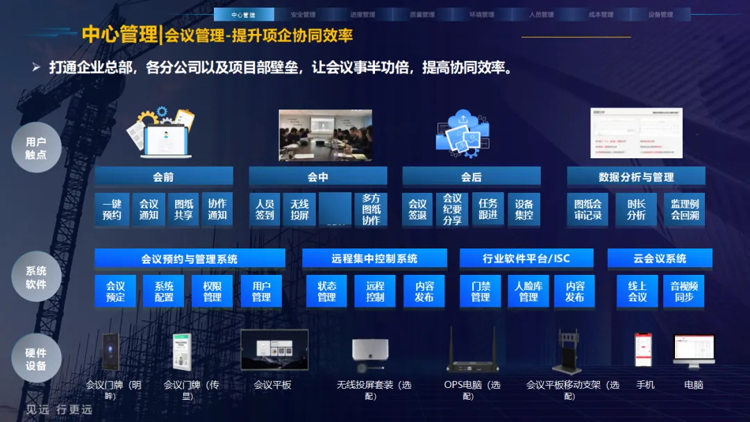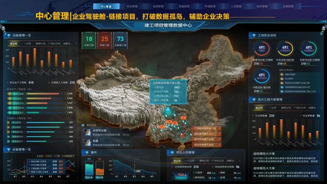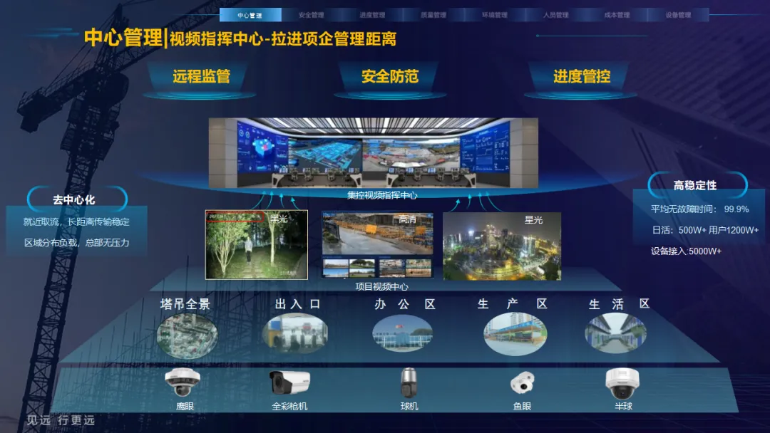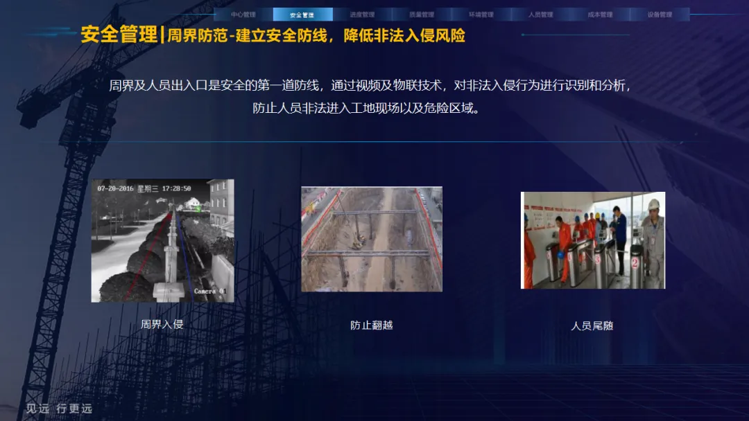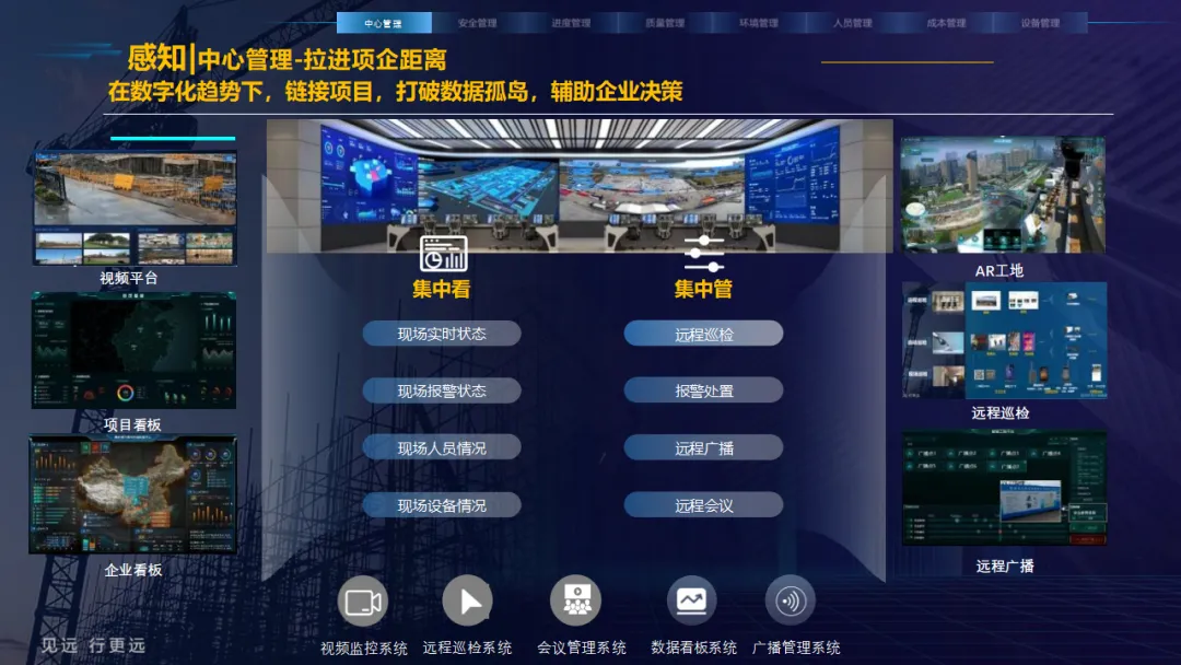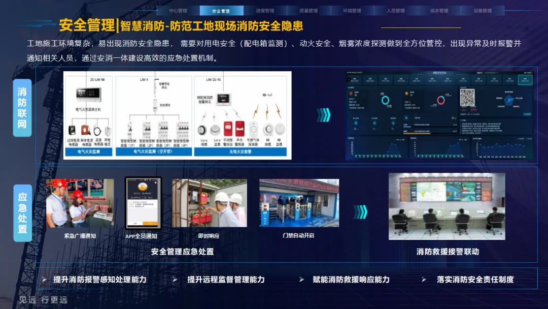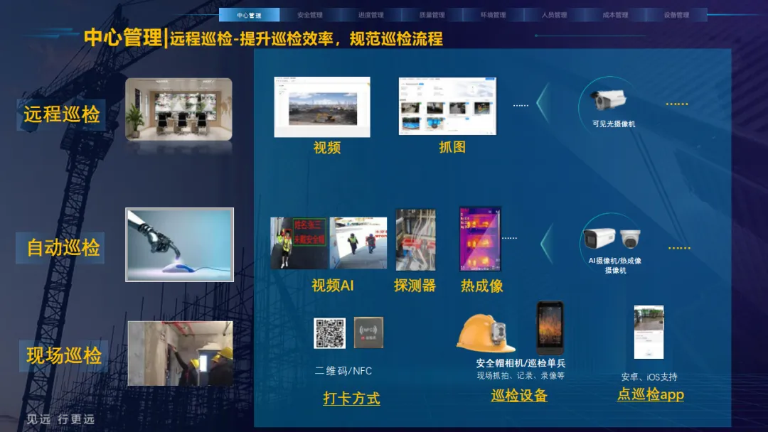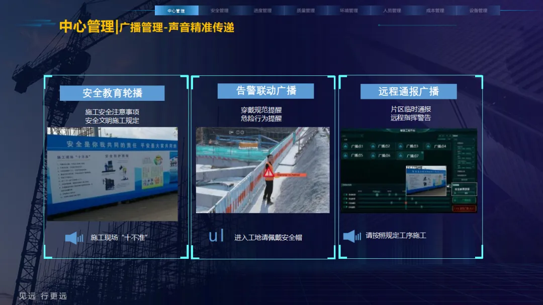 核心应用亮点突出:安全管理涵盖塔吊监控、高支模监测、智能隐患识别等,全方位防范安全事故;人员管理通过劳务实名制、关键人员考勤实现精准管控;环境管理聚焦扬尘监测、裸土覆盖监管、车辆净车出场,满足绿色施工要求;同时配套进度追溯、无人值守过磅、工程车辆盲区预警等功能,覆盖施工全流程。