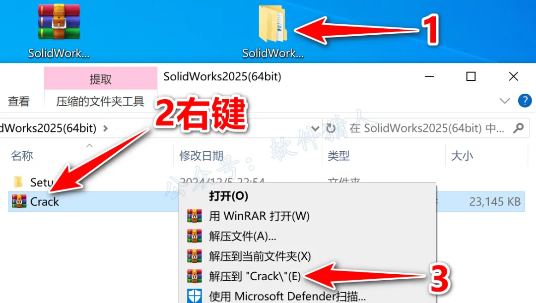 2.打开解压后的文件夹,①鼠标右击【Crack】压缩包;②选择电脑上安装的解压软件;③点击【解压到Crack】。