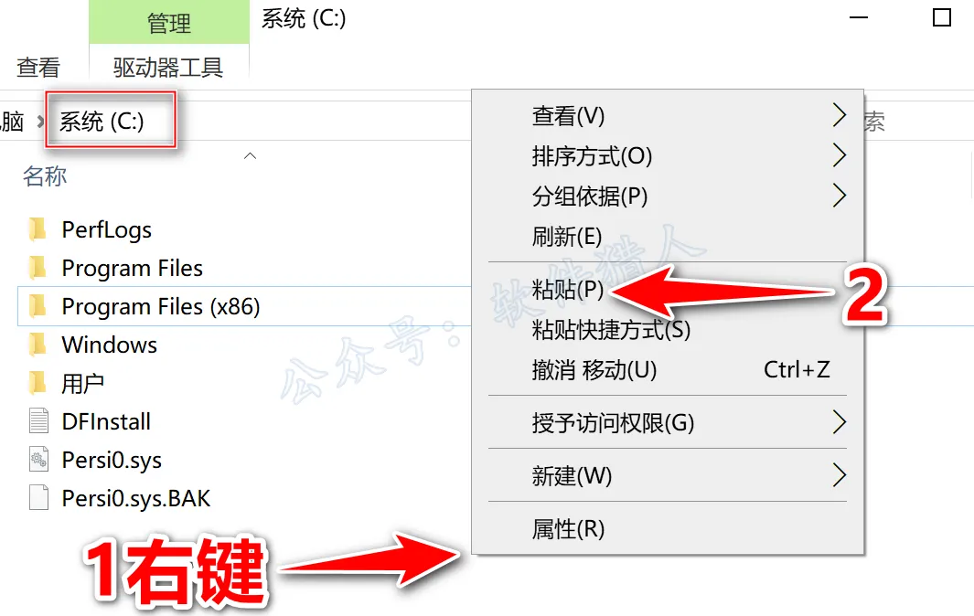 8.打开电脑C盘,鼠标右击空白处选择【粘贴】。