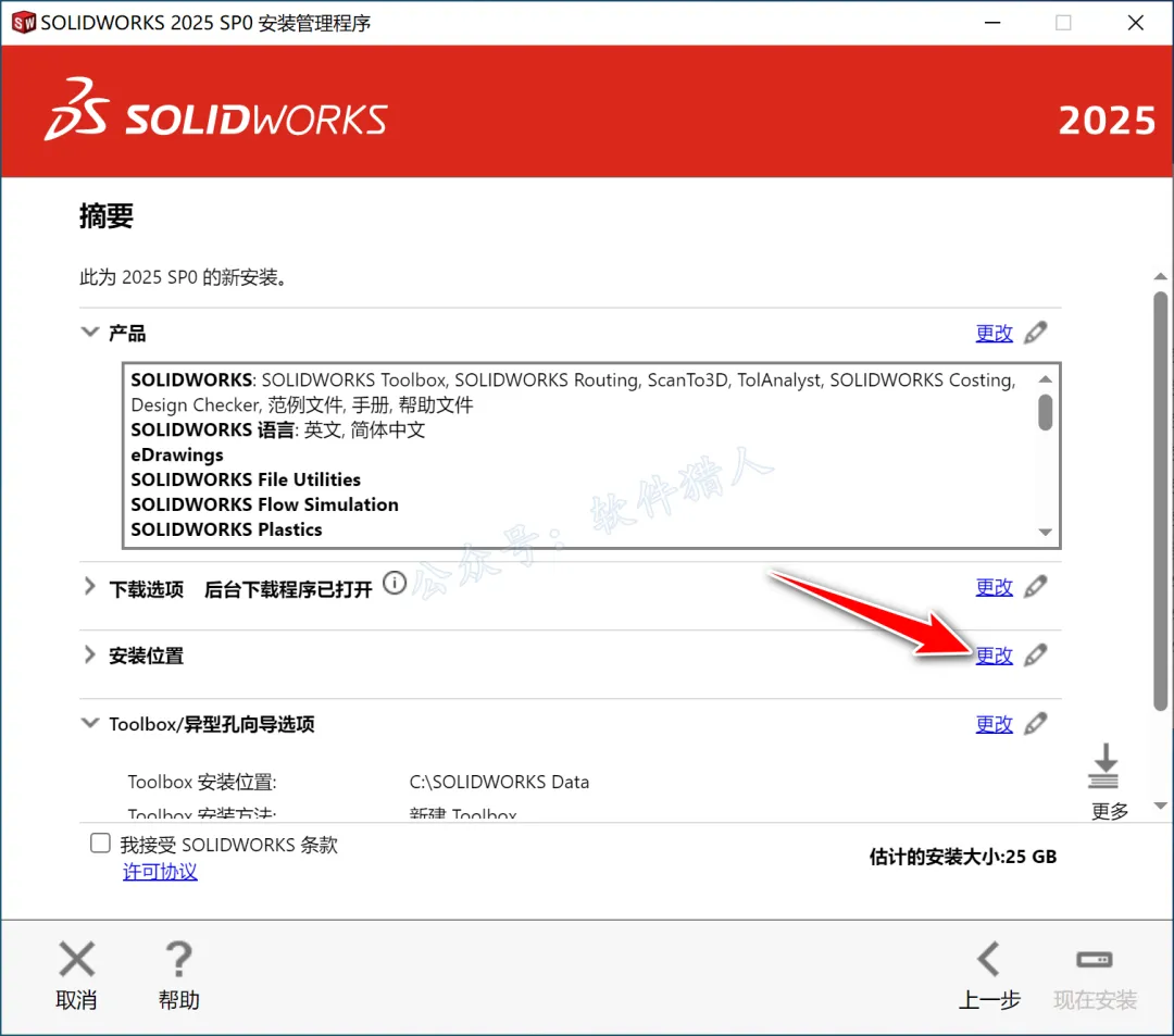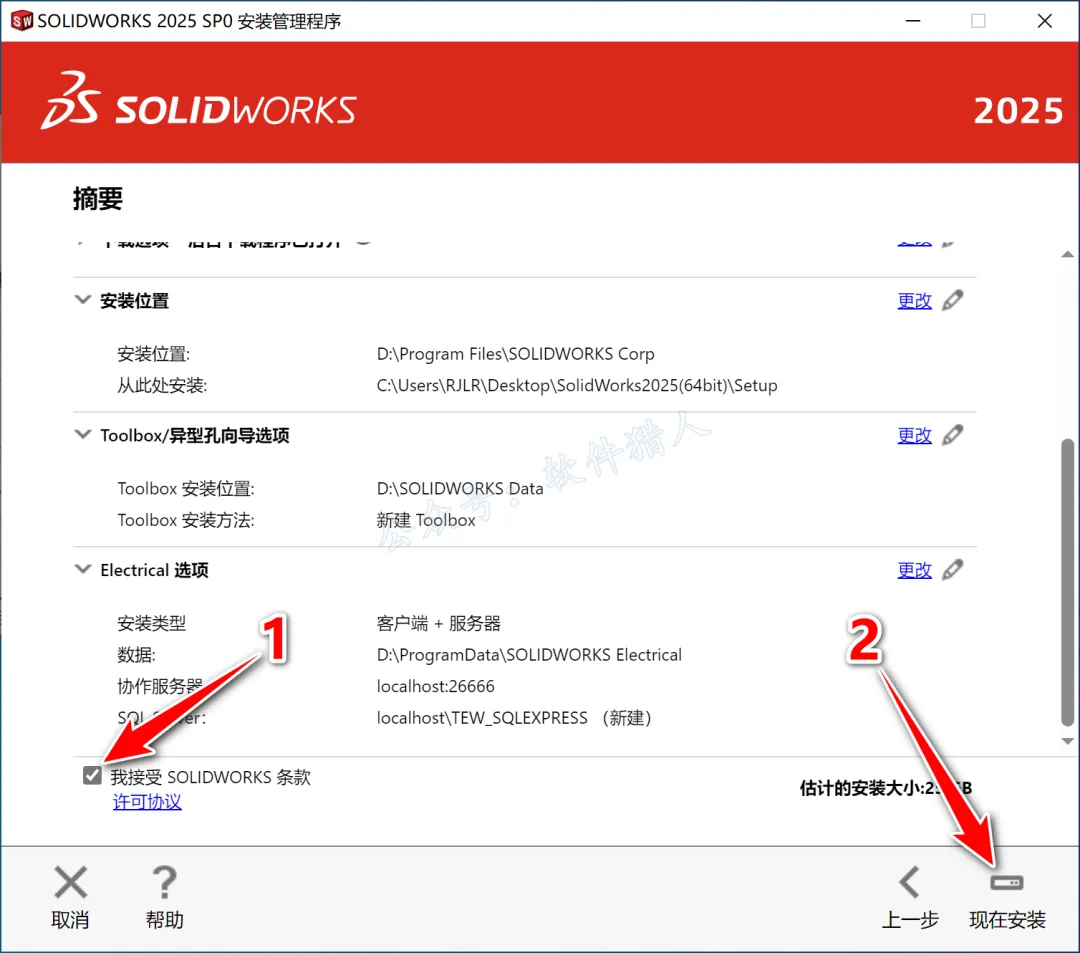 24.勾选【我接受 SOLIDWORKS 条款】,点击【现在安装】。